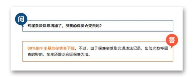 此外,平安产险则在回答关于“专属条款保障增加了,那我的保费会变贵吗?”的问题时,表示80%的车主基准保费会下降。不过,由于保费会受到交通违法记录、出险次数等因素的影响,还需以实际保费为准。
