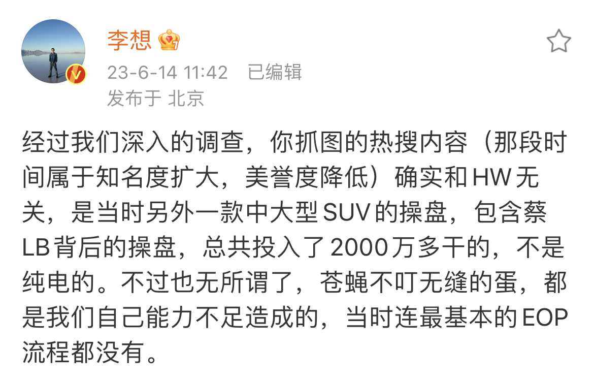 而让人意外的是,李想的感想还在继续。6月14日,李想又发了一条回应网友的微博,内容如下: