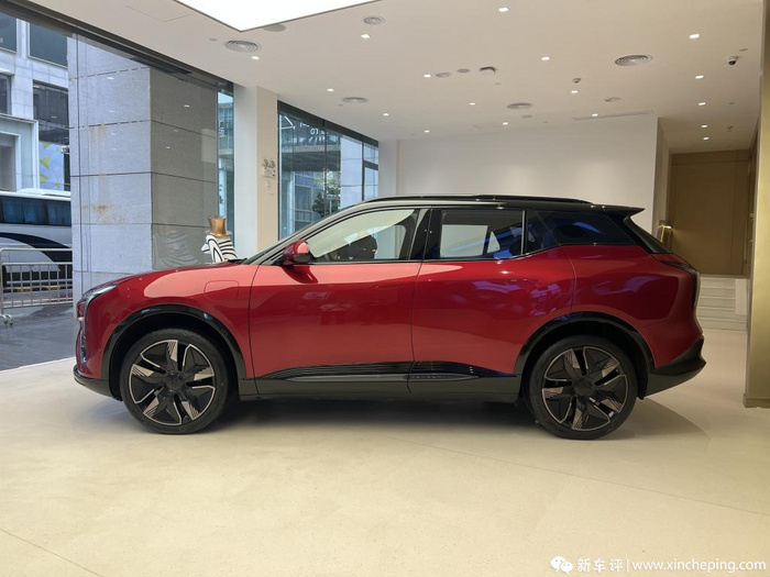 侧面,展车采用了红黑双色的车身搭配,长宽高分别为4725mm/1925mm/1676mm,轴距为2780mm,同时配备21英寸的轮胎及低风阻轮圈。此外,新车在外观上提供7种颜色可选,且均为双色搭配,同时还提供18寸和21寸三种轮圈可选。