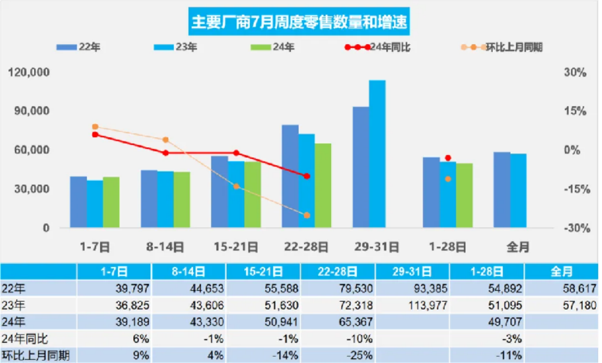 不过,相比去年同期和上月市场表现,7月销量映射出车市依旧存在较大承压。数据显示,7月1日-28日乘用车累计零售销量同比去年下降3%,环比6月下降11%。