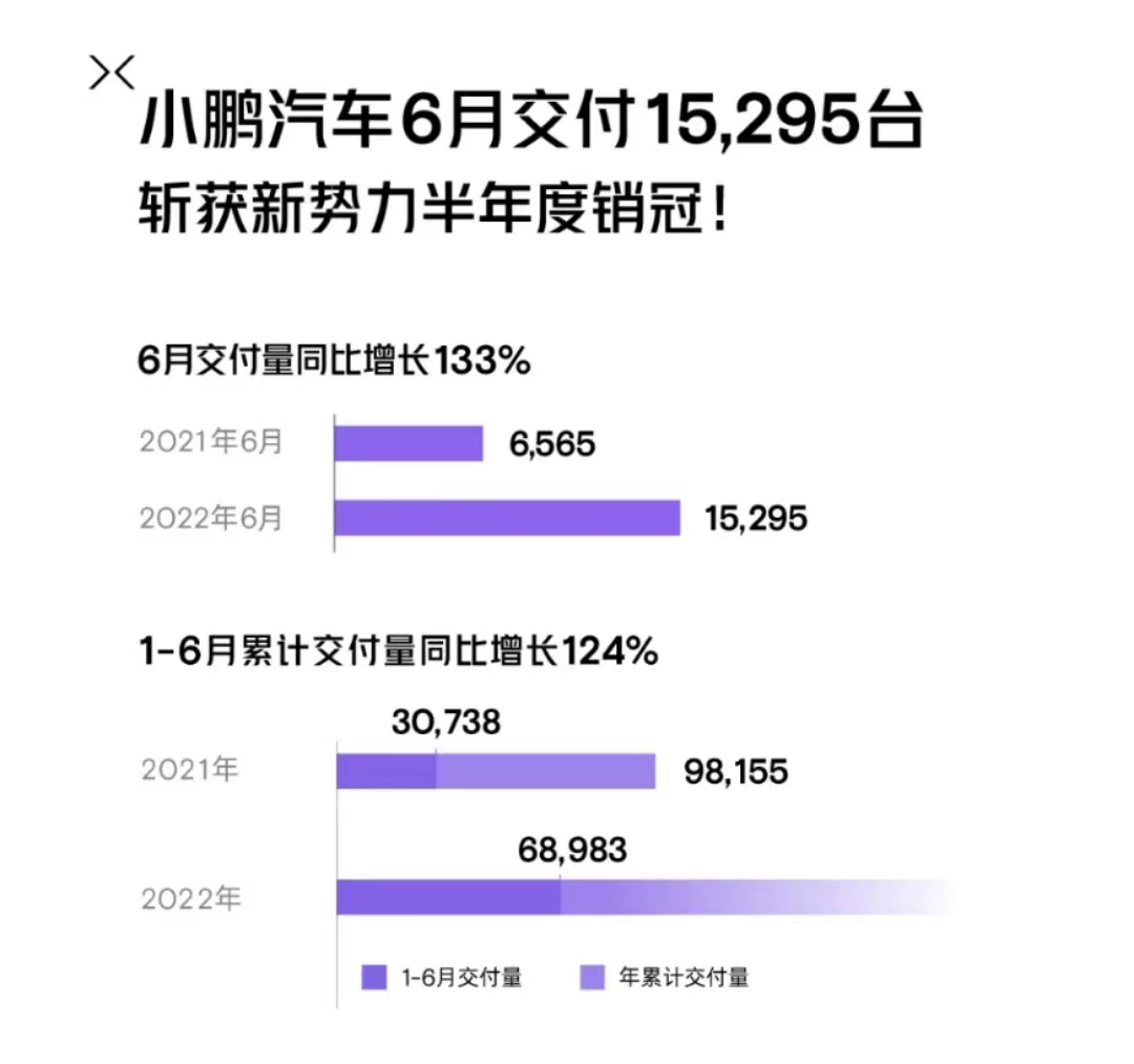 换言之,仅以目前的战略布局分析,小鹏位于终端无疑囊括了更多的潜在用户,进而实现最大化的量变。而刚刚过去的6月,上述良好的势头无疑还在延续。从其官方公布的数据来看,小鹏共交付新车15,295辆,同比增长133%。