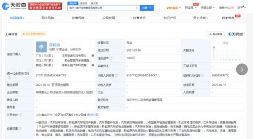9月17日,天眼查App显示,9月16日,临沂小鹏汽车销售服务有限公司成立,法定代表人为李初旭,注册资本1000万,经营范围包括新能源汽车整车销售;新能源汽车换电设施销售;汽车新车销售;充电桩销售;电车销售等。股东信息显示,该公司由小鹏汽车销售有限公司全资持股。