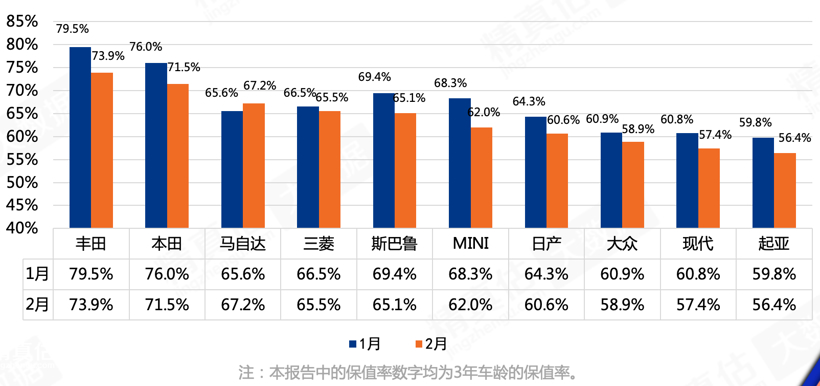 其中,以本田和丰田在内的五家日系厂商包揽前5名位置,一直以来丰田、本田表现稳定,其2月份三年保值率分别为73.9%和71.5%,与大众的58.9%保值率拉开一大段距离。