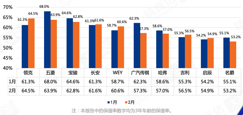 排名第二和第三的五菱和宝骏分别较1月份环比下滑4.1%和1.8%,与五菱和宝骏相反的是长安、WEY、吉利保值率在逐步提高。