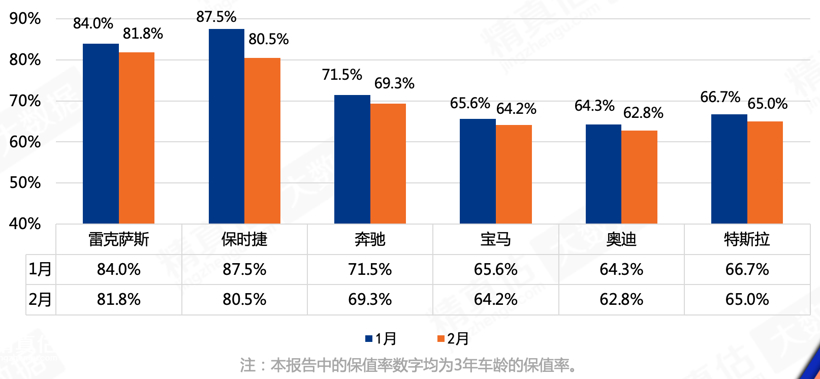 一直以来,奔驰、宝马、奥迪作为中国豪华市场一线品牌,常年包揽该市场销量前三。不过,从该报告中可以看出,雷克萨斯和保时捷三年保值率排名则超越BBA,其中雷克萨斯三年保值率高达81.8%,与BBA的60%左右保值率拉开一大段距离。