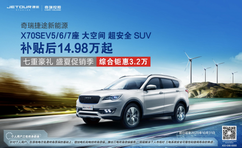 此次奇瑞捷途新能源盛夏促销季活动将持续到10月底。即日起至2020年10月31日,凡订购捷途X70SEV,即可尊享7重豪礼: