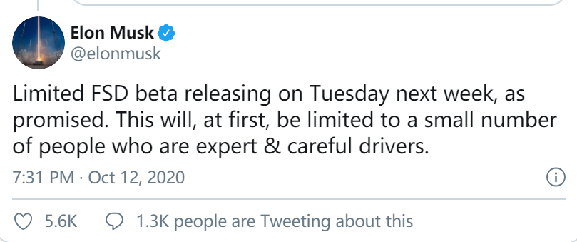 悠车日志讯 据外媒报道,似乎特斯拉终于准备好要推出其全自动驾驶(FSD)套件的首个测试版。该公司首席执行官埃隆马斯克在推特上表示,限量FSD测试版将于10月20日(下周二)推出,不过该测试版只面向“专业而谨慎的驾驶员”。