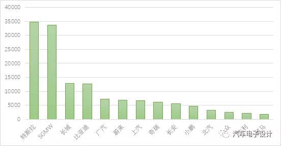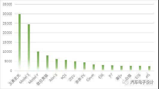 首先来看一下厂家的纯电动汽车的排名,这个比较有意思,由于剔除了插电式混合动力,我们可以专注的看一下整体的纯电动汽车的情况。特斯拉和五菱在各自的领域里面,单靠BEV拉高到了3万以上。紧随其后的长城和比亚迪的纯电动规模在1万台左右。5000台以上的主要有广汽、蔚来、上汽、奇瑞和长安。