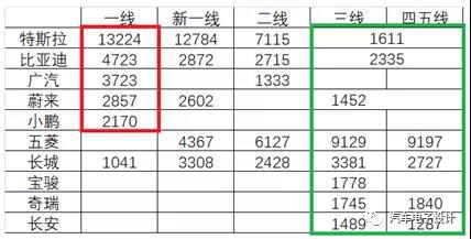 如果按照上一次排的数据,从一线-四五线城市的上险地理位置分配,目前特斯拉是贴着一线、新一线和二线在打,在三线以下的城市只有1611台;蔚来的打法也是相似的,主要在一线和新一线去扩展订单。我们看到的A00级别为主的,从五菱、长城、奇瑞和长安都是围着二线以下的城市在打。备注:新一线里面长城和五菱的渗透我们后面单独分析