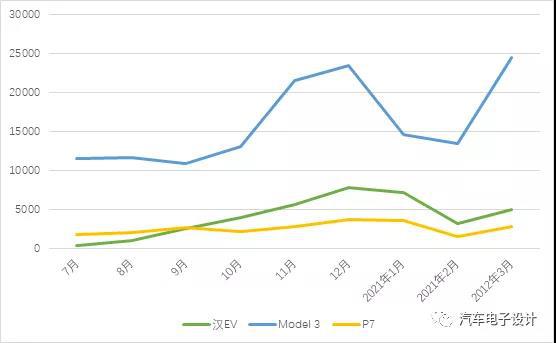图5 Model 3 和主要的竞品P7、汉EV的上险数据对比